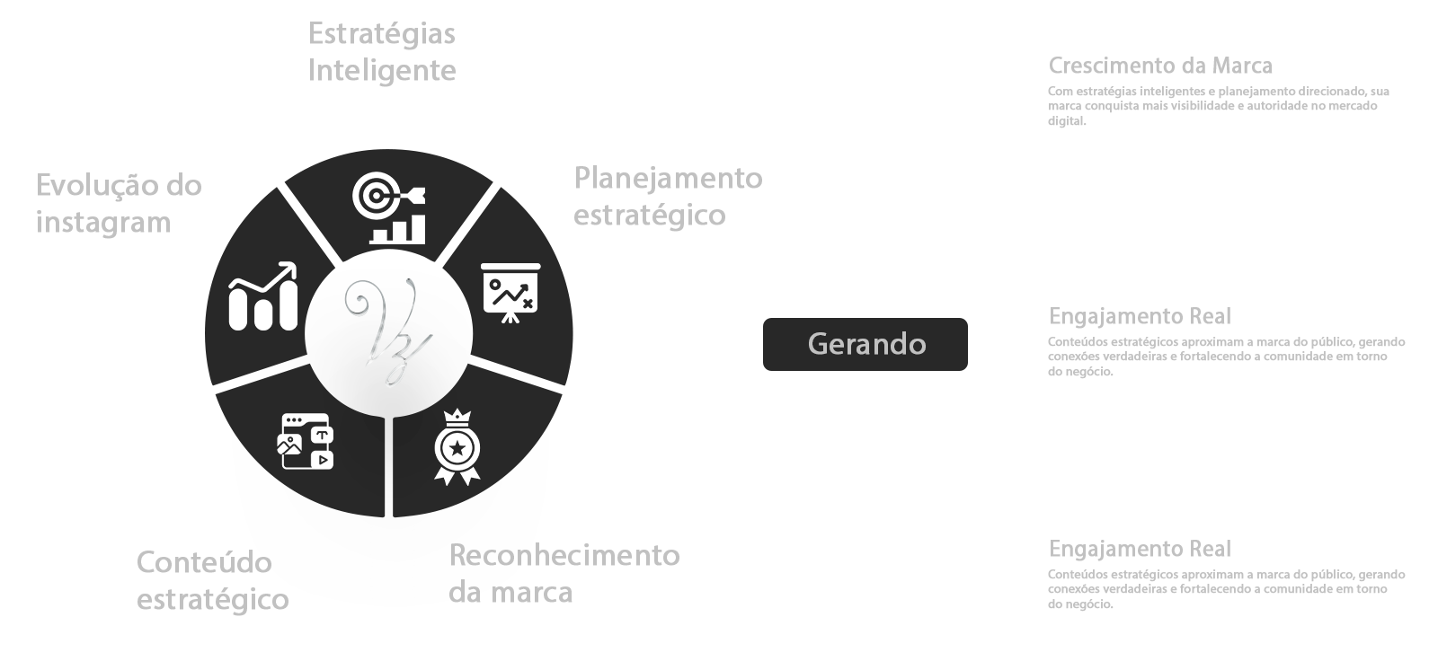 Para clientes que buscam uma gestão completa, profissional e alinhada aos seus objetivos de negócio. Criamos calendário editorial, produção de conteúdo, copywriting estratégico, engajamento qualificado, gestão de anúncios e relatórios de performance. Tudo com foco em ROI, não apenas em curtidas.